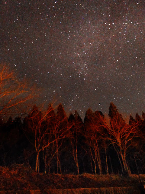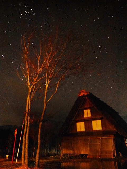 我們一行人看了好一陣子之後又意猶未盡的走過門口的兩間合掌屋,到靠近馬路的地方散步。夜晚沒有車也沒有燈,僅靠著星光跟小燈在黑漆漆的路上漫步著,感覺好棒。又在馬路的地方看了好一陣子星星才心滿意足的回去。