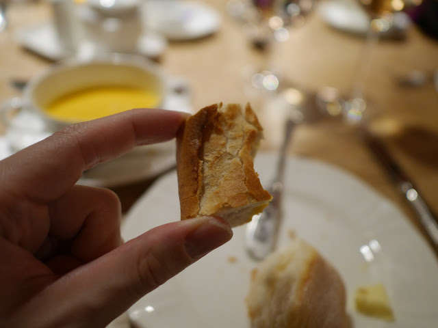 接下來上的是南瓜濃湯跟麵包,提供了三款麵包讓我們選擇...麵包...真的好好吃,法國麵包濕潤鬆軟與外皮的硬脆兼具、 餐包則是口感較軟,味道完全不一樣。我們很快的沾著奶油吃光一籃之後又再點了一籃。